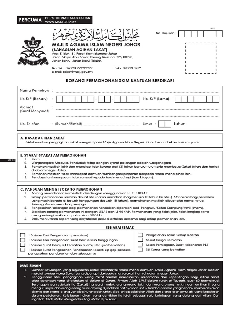 Skim Bantuan Zakat Pendaftaran IPT Untuk Anak Johor. Permohonan Bantuan Secara Online Kepada Mereka Yang Menepati Syarat Penerima Bantuan Majlis Agama Islam Negeri Johor. MAIJ merupakan majlis agama Islam yang berfungsi untuk menguruskan hal ehwal agama Islam di Negeri Johor dan menguruskan kumpulan wang zakat dan fitrah serta.